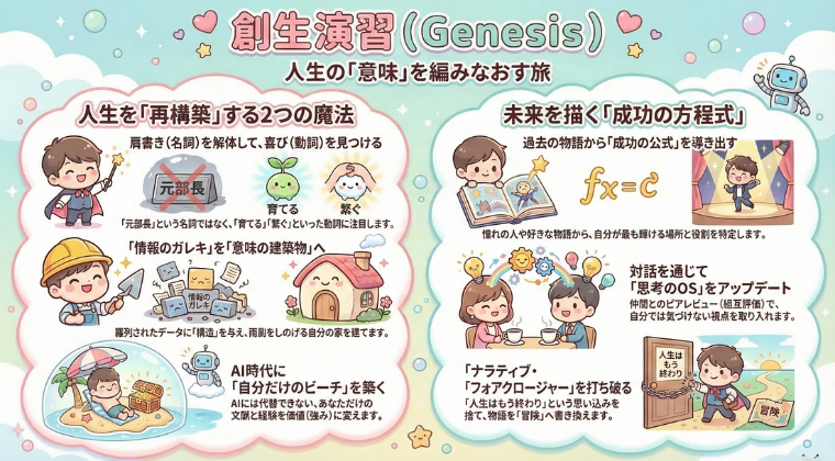 - 肩書き(名詞)から喜び(動詞)へ: 「元部長」といった過去の役割(名詞)への執着を解体し、「人を育てる」「繋ぐ」といった、肩書きがなくても実行可能な自分自身の根源的な喜び(動詞)を抽出します 。