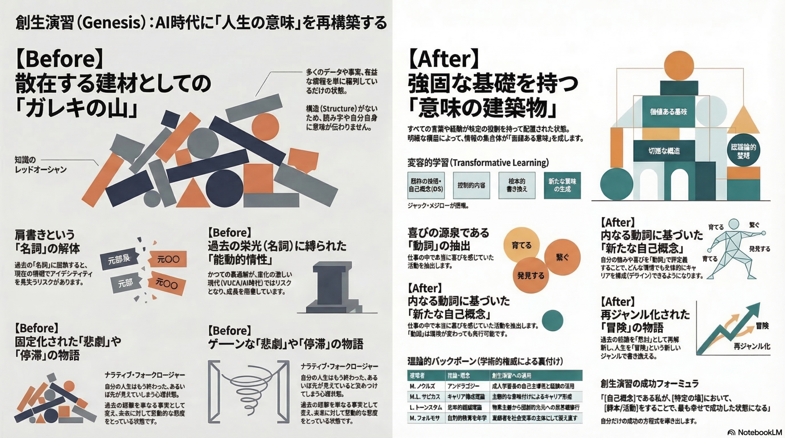 私たちが目指すのは、長年培ってきた「〇〇部長」といった過去の「名詞(肩書き)」を解体し 、これからの人生で実行し続ける普遍的な「動詞」を抽出することにあります 。